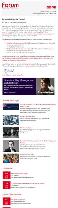 Abonnieren Sie kostenlos den Newsletter von forum Nachhaltig Wirtschaften