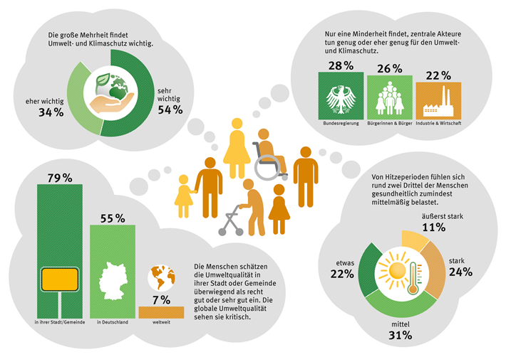 Für die Mehrheit der Menschen in Deutschland hat der Schutz von Umwelt und Klima weiterhin einen hohen Stellenwert. Allerdings nimmt die Bedeutung dieses Themas in der Wahrnehmung der Bevölkerung weiter ab. Als dringlicher empfinden viele Bürgerinnen und Bürger die Situation im Gesundheits- oder Bildungssektor, die wirtschaftliche Entwicklung sowie die öffentliche Sicherheit und Kriege.