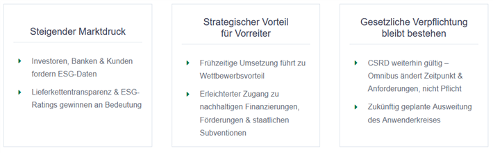 Weniger Bürokratie, mehr Klarheit: Das EU-Omnibus-Paket soll Nachhaltigkeits- und Sorgfaltspflichten vereinfachen. Das Webinar zeigt, was sich bei CSRD, CSDDD und EU-Taxonomie ändern soll – und wie Unternehmen davon strategisch profitieren.