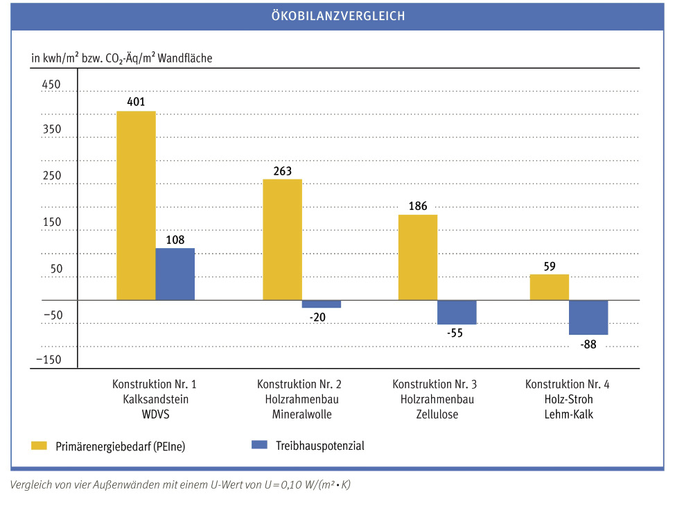 Bei gleicher Dämmqualität eines guten Passivhausstandards benötigt eine mit Lehm- und Kalkputz verkleidete strohgedämmte Wand für ihre Herstellung lediglich einen nicht erneuerbaren Primärenergiebedarf von etwa 59 kWh/m2, eine herkömmliche Kalksandsteinwand das Sechsfache: 401 kWh/m2, eine mineralfasergedämmte Holzrahmenwand mehr als das Vierfache: 263 kWh/m2 und eine übliche zellulosegedämmte Holzrahmenwand etwa das Dreifache: 186 kWh/m2. Nicht eingerechnet in diese Bilanz ist der Rückbau der Gebäudeteile. Die Rückführung von Stroh, Lehm und Kalk in die natürlichen Stoffkreisläufe verläuft ohne zusätzlichen Energieaufwand. Dies ist bei einer Kalksandsteinwand mit Wärmedämmverbundsystem nur mit hohem Energieeinsatz möglich.