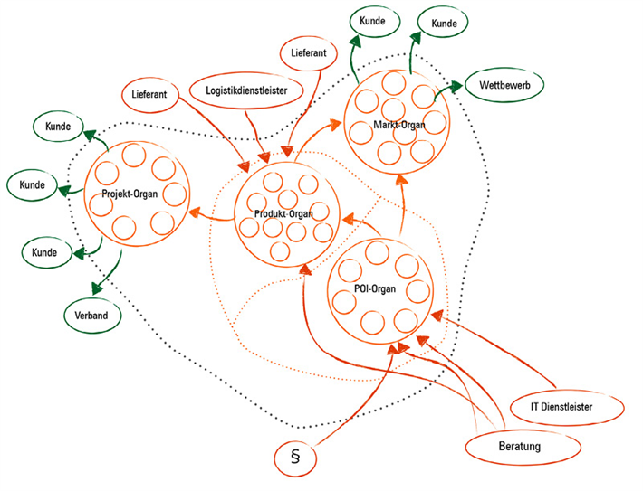 Heute arbeiten die Mitarbeiter selbstbestimmt in funktionsübergreifenden Teams. Diese sind in sogenannte Organe eingeteilt: Markt, Projekt, Produkt und POI (Prozesse, Organisation & Information). Sie haben übergreifende Prozessverantwortung. Die Mitarbeiter sind in der Lage und aufgefordert, über den eigenen Tellerrand hinauszuschauen und zusammenzuarbeiten. Neu ist die Rolle von sogenannten Betriebs-Katalysatoren. Sie beraten bei Problemen. Sie moderieren Entscheidungsprozesse und sie bereiten Informationen für die Belegschaft auf, damit vernünftige Entscheidungen getroffen werden können. Heiler unterscheidet in Alltags-, Struktur und Strategieentscheide. So sind die Mitarbeiter in der Lage, auf operativer Ebene sehr selbstbestimmt zu arbeiten – ohne den Geschäftsführer miteinzubeziehen. Bei Struktur- und Strategiethemen geht die Entscheidung in die Gruppe. Zum Beispiel unterliegen Personalprozesse den Organen. Die jeweiligen Teams entscheiden, ob Bedarf für neue Mitarbeiter besteht. Auch die Vorstellungsgespräche und die Entscheidung über die Einstellung liegt bei den Mitarbeitern. Allein die Budgetierung bedarf einer Absprache mit dem Geschäftsführer. Weiter partizipiert jeder auf struktureller und strategischer Ebene aktiv. Eine Ausnahme bleibt bisher das Gehaltssystem. Nicht etwa, weil Stephan Heiler es vermeidet – die Belegschaft selbst geht das Thema (noch) nicht an.|